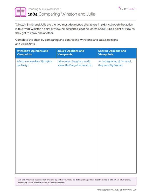 Comparing and contrasting is a critical thinking skill essential to students’ success both in and outside school. Students will use this worksheet to list the similarities and differences in the viewpoints between the two main characters in 1984. Encourage students to fill out the chart as they learn new aspects of each character’s personality or point of view.