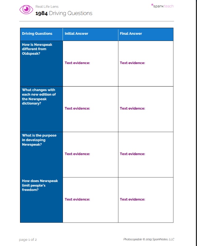Hand out the Driving Questions Worksheet. Review the questions as a class. Students should enter initial answers to the questions both before and as they read 1984. They will revisit the questions and revise their answers following the lesson activities, classroom discussion, and the completion of the text. Remind students to support their responses with text evidence.