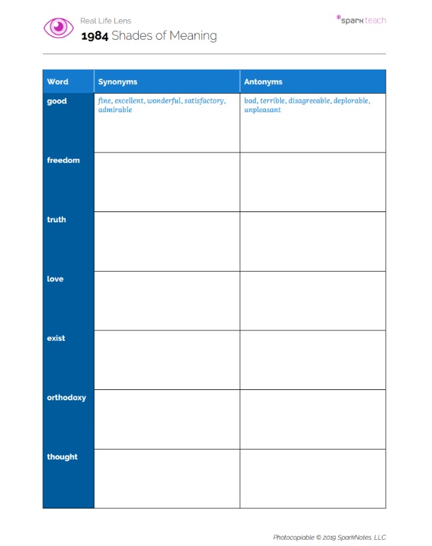 -List synonyms and antonyms for specific words from 1984. They can use dictionaries or online resources to help however you would prefer.