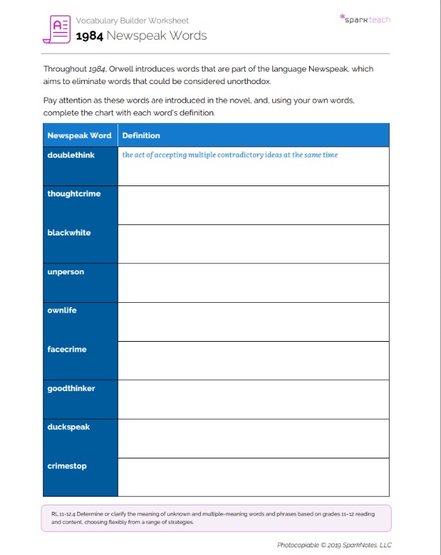 To fully understand any story, the reader must understand the language spoken by its characters, and this includes the language of Newspeak in 1984. This worksheet presents Newspeak words that students will encounter as they read the novel. Instruct students to look for these words as they read and to complete the chart by writing what they understand to be the definition of each word. Students should continue to complete this chart throughout the reading of 1984.