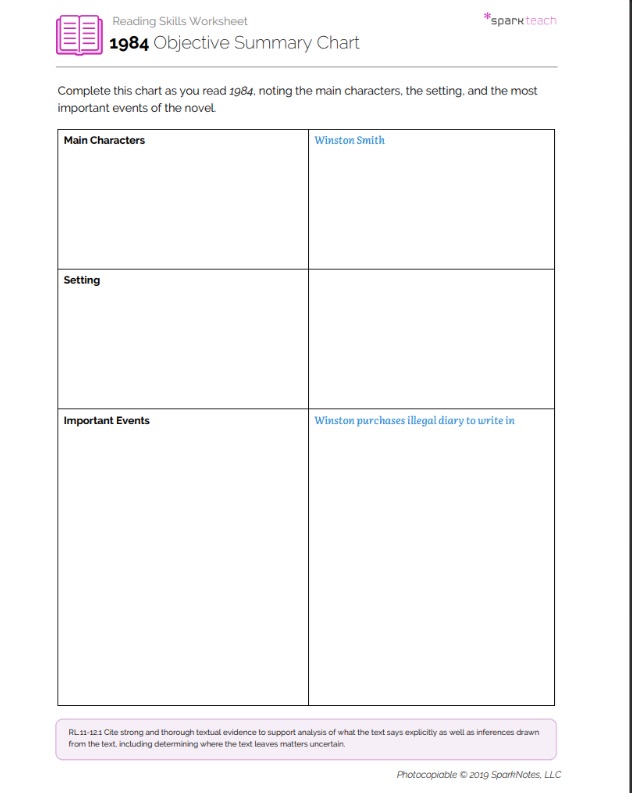 Learning how to effectively summarize enables students to quickly get to the core of a story and focus on the more meaningful elements of a text. Students will use this worksheet to record the most important aspects of 1984 as they read. Pass out the worksheet before students begin reading the novel. Remind students to only list characters and events that are essential to understanding the story and to refrain from including any personal opinions about the characters, setting, and events. Once students’ charts are completed, consider having students write a formal essay summarizing the novel.
