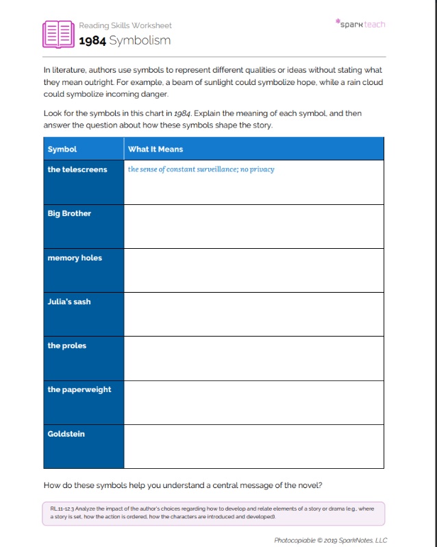 Authors use symbols to represent major themes, provide information about a character or event, and add layers of meaning to the text. Students will use this worksheet to explore how Orwell uses various symbols in 1984 and how those symbols shape a central message of the novel. Ask students to pay attention to when these symbols are introduced and why they think Orwell included them. Have students answer the question at the bottom of the worksheet after they have finished the novel and completed the chart.