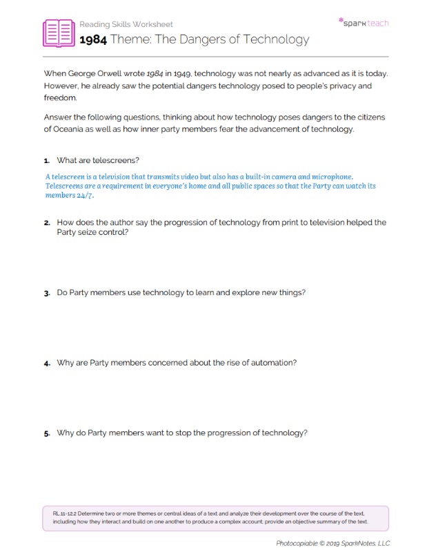 Thoroughly exploring a single concept enables students to better understand a text’s larger themes. Students will use this worksheet to answer questions about how technology can invade people’s freedom and privacy as well as how the advancement of technology may seem dangerous to the inner party members.