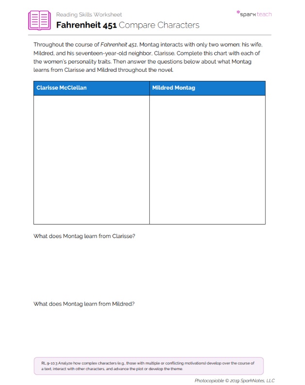 Comparing characters and noting how characters relate to one another enables students to understand characters’ motivations and personalities better. Students will use this worksheet to compare Clarisse McClellan and Mildred Montag and answer questions about what Guy Montag learns from each of these women based on their personalities. Pass out the worksheet before students begin reading the novel. Encourage students to fill out the chart as they learn new aspects of each character’s personality. Have students complete the questions after they have completed the novel.
