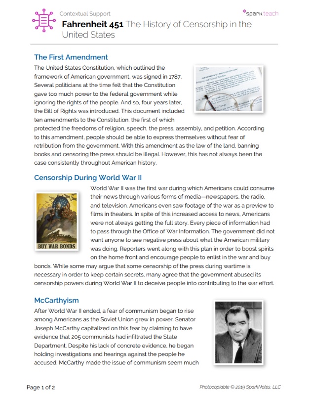 Although the United States prides itself on freedom of speech being the law of the land, Ray Bradbury saw government censorship as a real threat in the early 1950s and wanted to warn people about the dangers of such censorship. This handout gives students important background information about the history of censorship in the United States from the creation of the Bill of Rights until today. Use this handout to spark discussion and debate in your classroom. Encourage students to identify examples of censorship they’ve witnessed or experienced. Ask critical thinking questions, such as: