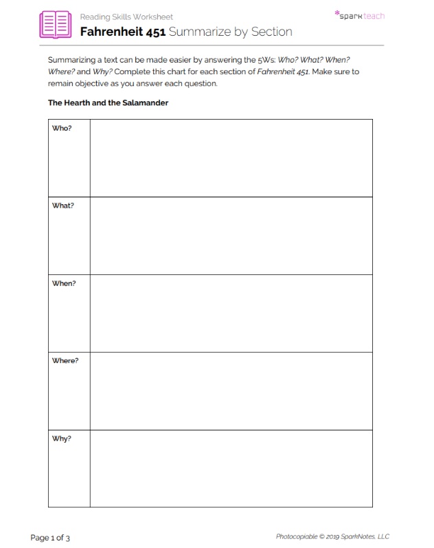 Being able to summarize objectively helps students quickly identify the basic facts of a story before analyzing it further. Students will use this worksheet to record answers to the questions Who? What? When? Where? and Why? for each section of Fahrenheit 451 as they read the novel. Remind students to remain objective in their answers to each question. If your class needs more support, pass out the sample response and review it together as a class, or complete the first chart together.