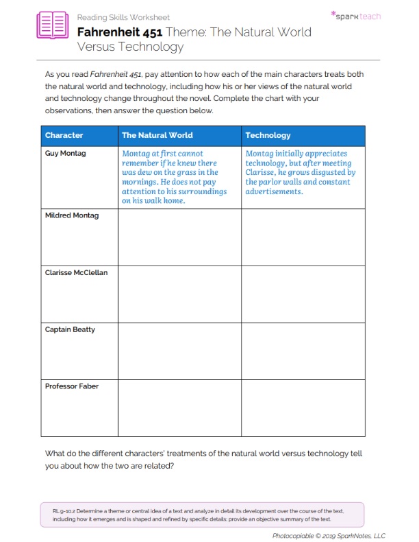 Comparing two themes in a fictional text allows students to see how the themes build on and support one another. Students will use this worksheet to explore how the novel’s main characters treat the natural world versus how they treat technology and answer a question about how these two themes are related. You can use this worksheet as students are reading or after they’ve completed the novel.