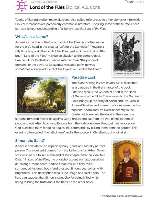 Literary allusions create thematic connections between a story and a different story, character, or historical event. Allusions also reveal meaning in a subtle yet powerful way. Use this contextual support handout to help students better understand the biblical allusions woven throughout Lord of the Flies and to spark discussion in your classroom. You may want to wait until students have read at least half of the novel to avoid spoilers.