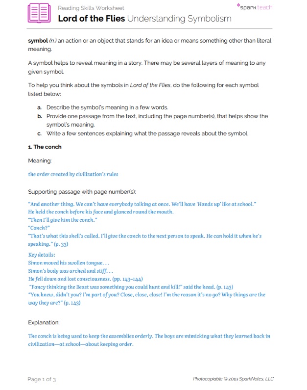 Authors often use symbols to express meaning and reveal truths in a story. Students will use this worksheet to examine and explain specific symbols in Lord of the Flies, which will contribute to their understanding of symbolism as a literary device. They will identify important passages that give insight into the meanings of important symbols and write explanations of each. As a class, review the definition of symbol. At different points in the reading or at the end of the novel, students can compare their responses in small groups or as a class.