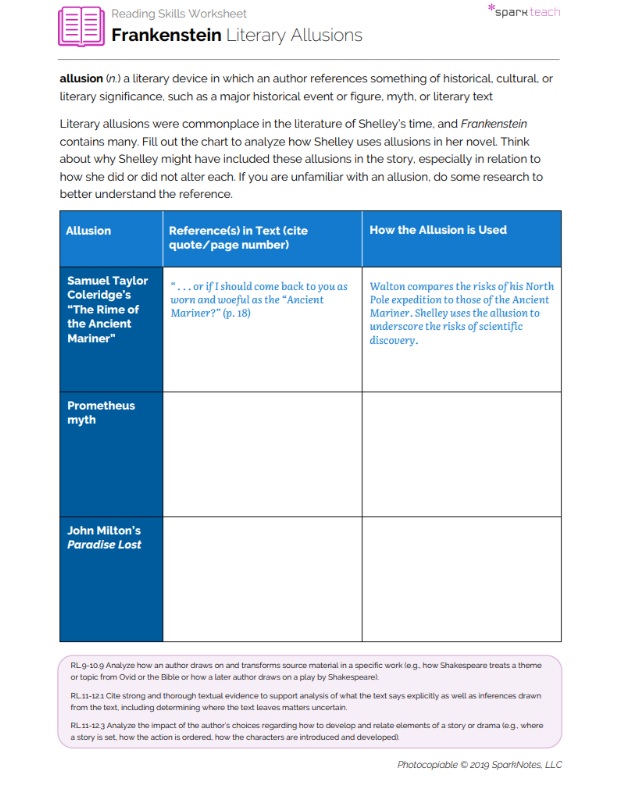 Allusions add layers of meaning to a text by referring to an idea, event, or character in literature in an indirect way. Use this worksheet to help students analyze the literary allusions found in Frankenstein. Hand out the worksheet before students begin to read and have them research each thing that is alluded to. When students come across each allusion, they should first record the quote and page number where the reference is located. After students finish reading the novel, have them return to the worksheet to complete their analysis. Use the worksheet to prompt a class discussion about how Shelley uses allusions and why Shelley might have included these allusions in her novel.