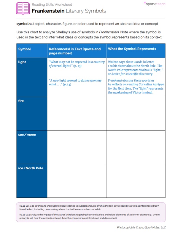An understanding of symbolism is crucial to appreciating many works of literature. Many authors use symbols to express major themes and ideas in a text, and the result is oftentimes more effective than if they were to simply state the idea outright. Use this worksheet to help students identify and analyze Shelley’s use of symbols in Frankenstein. Students can fill out the worksheet as they work through the novel or at the novel’s conclusion.