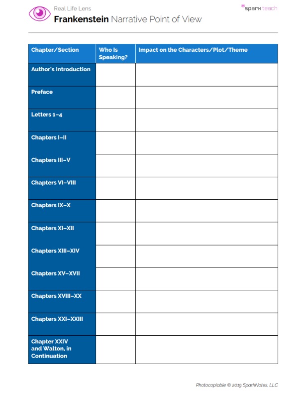 Have students use the back of the worksheet to analyze and write about the author’s purpose in using the first-person point of view. Why might Shelley have wanted to tell her tale in the first-person rather than utilize, for example, a third-person omniscient narrator?