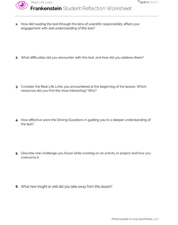 Hand out the Driving Questions Worksheet. Review the questions as a class. Students should enter initial answers to the questions before and as they read Frankenstein. They will revisit the questions and revise their answers following the lesson activities, classroom discussion, and completion of the text. Remind students to support their responses with text evidence.