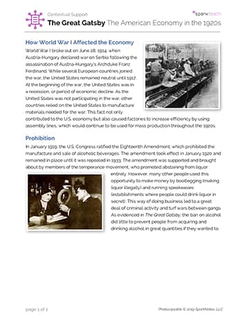While most students have heard of the Great Depression, many may not be familiar with other important historical and cultural changes happening in the U.S. during the era in which The Great Gatsby is set. This handout gives students important background information about the economy after World War I, the effects of prohibition, the new emphasis on consumerism, and the events leading up to the Great Depression. Use this handout to spark discussion and debate in your classroom and allow students to express personal experiences related to the issues described.