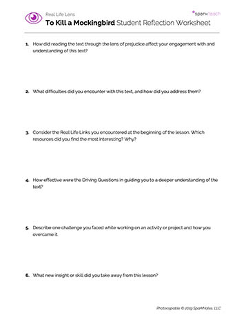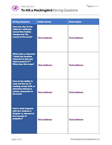 Hand out the Driving Questions Worksheet. Review the questions as a class. Students should enter initial answers to the questions before and as they read To Kill a Mockingbird. They will revisit the questions and revise their answers following the lesson activities, classroom discussion, and the completion of the text. Remind students to support their responses with text evidence.