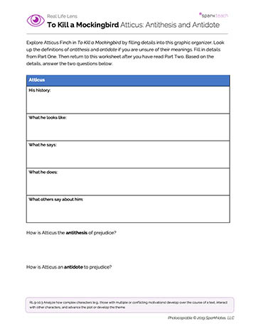 Hand out the Atticus: Antithesis and Antidote Worksheet. Explain that students will first use the chart to analyze Atticus as a father, lawyer, citizen, and friend. Then they will consider the larger role that he plays and represents in the novel. They can return to their work after they finish the novel to see if and how he changes or deepens in Part Two. Students will: