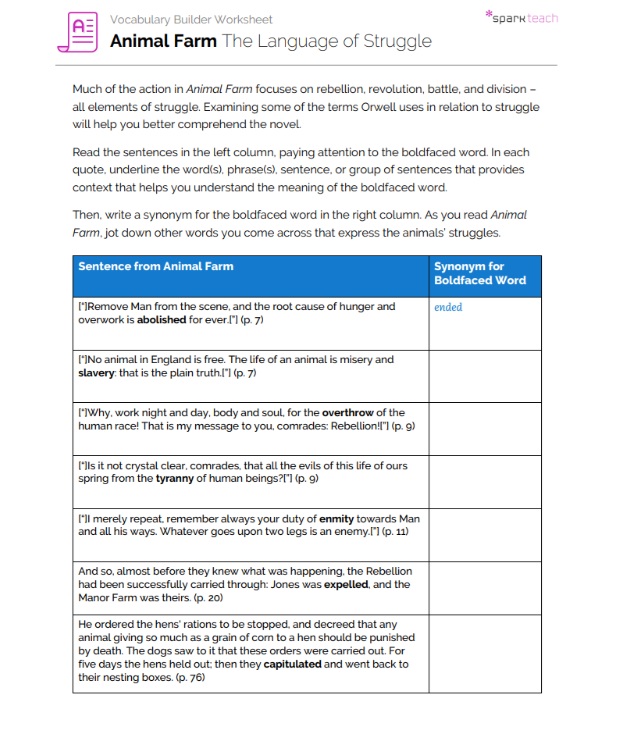 In Animal Farm, Orwell utilizes numerous words that help express the animals’ struggle for freedom. Students will use this worksheet to analyze and better understand the language of struggle used in the novel. Pass out the worksheet before reading begins so students can work as they read. Instruct students to use context clues to determine the meaning of the boldfaced words related to struggle. Then have them use context, prior knowledge, and dictionaries, if necessary, to write a synonym for each word.