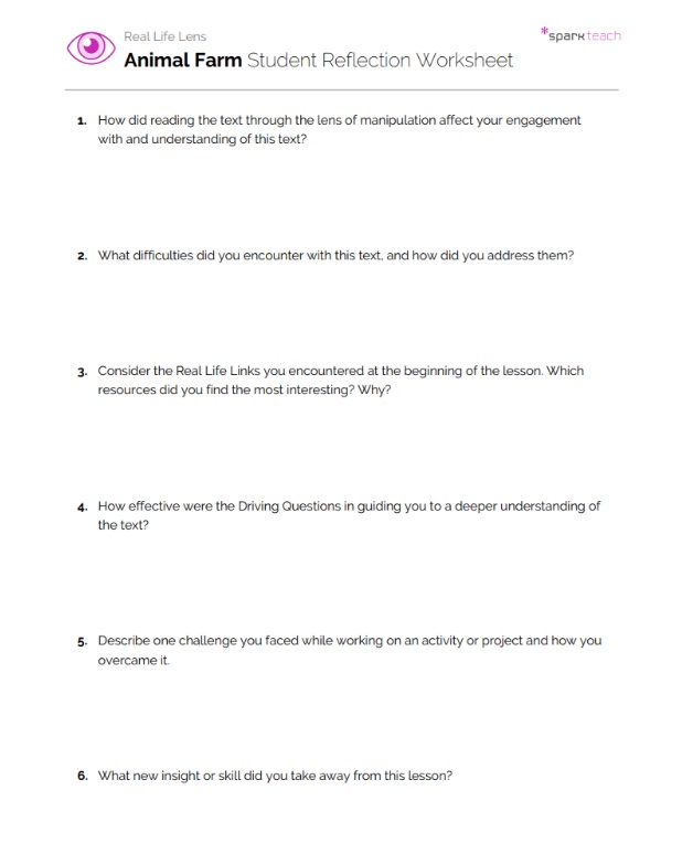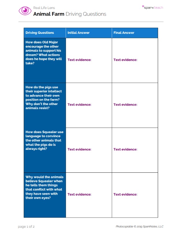 Hand out the Driving Questions Worksheet. Review the questions as a class. Students should enter initial answers to the questions as they read Animal Farm. They will revisit the questions and revise their answers following the lesson activities, classroom discussion, and completion of the text. Remind students to support their responses with text evidence.