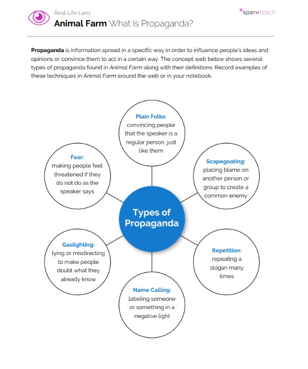 Students will first learn about propaganda through the What Is Propaganda? Worksheet. Pass out the worksheet. Review the introductory paragraph with students, and then have them work in their small groups to find examples of each propaganda technique from the text of Animal Farm.