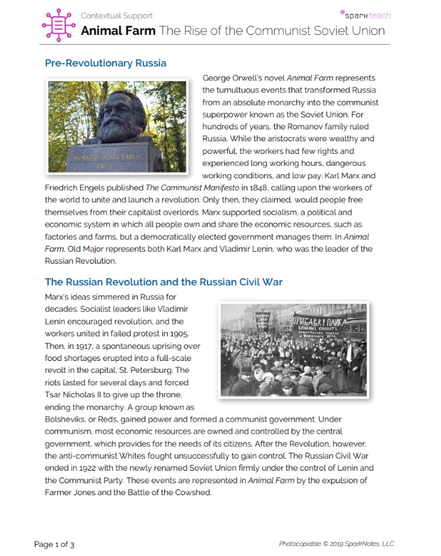 Animal Farm is an allegory for the events surrounding the Russian Revolution of 1917 and the development of the Soviet Union under the authoritarian ruler, Joseph Stalin. Almost every character and event in the novel, sometimes down to the smallest details, has an allegorical counterpart in history. This handout gives students relevant background information about these events, the leaders involved, and their actions. Use this handout to ensure that students understand the relationship between Animal Farm and real-life events so they can better analyze the book’s message. Encourage students to analyze, discuss, and debate the information provided in the handout, and consider assigning research projects for students to gather more information about the events and people detailed.
