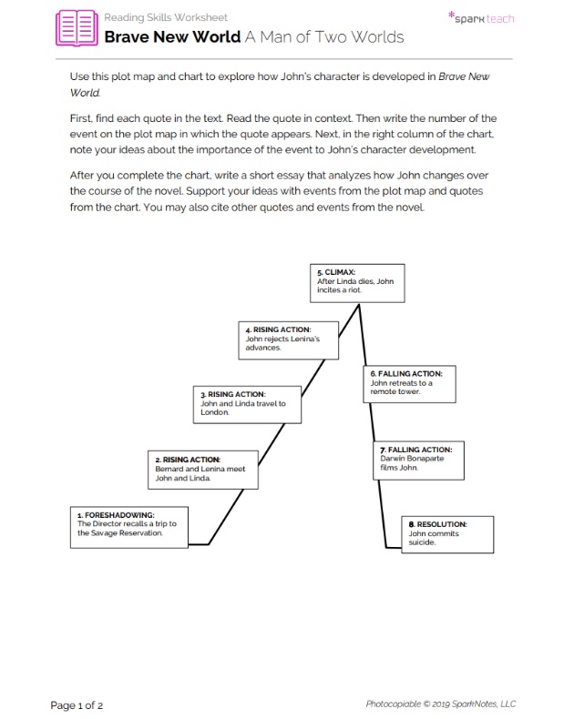 Working with a plot map that depicts the rising action, climax, falling action, and resolution of a plot can help students better understand not only a story’s action but also the themes, characters, and overall “big picture.” Students will use this worksheet to explore the development of John, the protagonist of Brave New World. Students will find quotes in the text, read the quotes in context, identify the events on the plot map in which the quotes appear, and note their ideas about the importance of the events to John’s character development. Students will then write short essays that analyze how John changes over the course of the novel.
