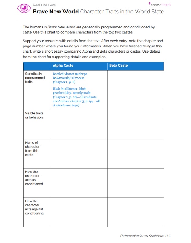 -Write short essays comparing Alpha and Beta characters or castes, using details from the worksheet for supporting details and examples.