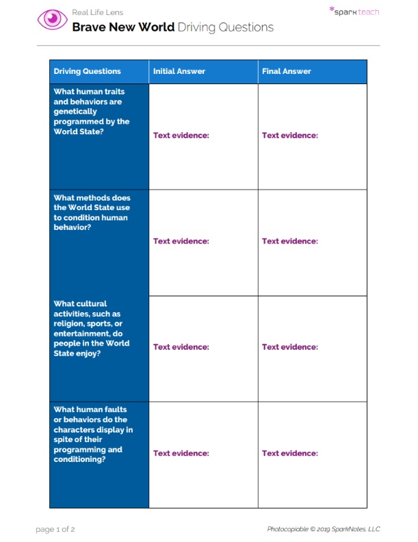 Hand out the Driving Questions Worksheet. Review the questions as a class. Students should enter initial answers to the questions before and as they read Brave New World. They will revisit the questions and revise their answers following the lesson activities, classroom discussion, and completion of the text. Remind students to support their responses with text evidence.