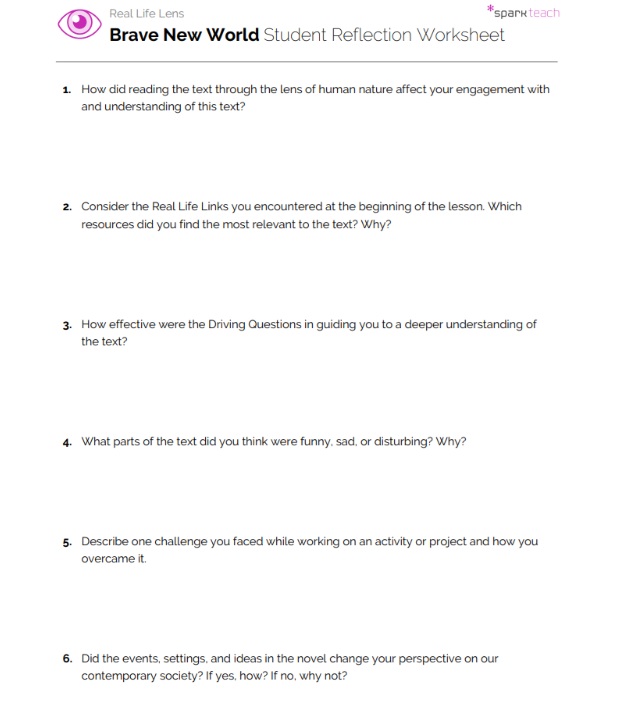 Use this Real-Life Lens Plan to help students appreciate and explore Brave New World by Aldous Huxley. Students will examine the novel’s settings, themes, actions, and characters through the lens of human nature. What human behaviors and emotions do the characters display? What happens when the World State modifies human traits and conditions human behavior? How are the humans of the World State different from the humans on a Savage Reservation? How are both sets of humans alike? What is the author saying about the state of being human?
