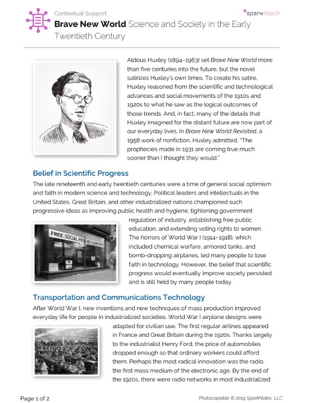 Aldous Huxley set Brave New World more than five centuries into the future, but the novel satirizes Huxley’s own times. This handout gives students important background information about science and society in the early twentieth century, the era that Huxley was satirizing. The handout provides students with information that will help them better understand the humor in the novel, interpret Huxley’s prophecies, and evaluate the degree to which Huxley’s prophecies have come true. Use this handout to spark discussion and debate in your classroom and allow students to express personal experiences related to the issues described.