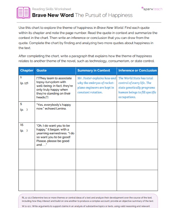 One of the central questions posed in Brave New World is What is the cost of human happiness? Students will complete a chart to explore how Huxley describes happiness and connects this emotion to other themes in the novel. Students will find quotes in the text, note the context of each quote, and draw inferences and conclusions about happiness based on reading these quotes in context. After completing the chart, students will write about how the theme of happiness relates to another theme of the novel, such as technology, consumerism, or state control.