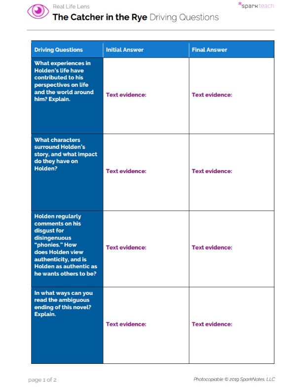 Hand out the Driving Questions Worksheet. Review the questions as a class. Students should enter initial answers to the questions before and as they read The Catcher in the Rye. They will revisit the questions and revise their answers following the lesson activities, classroom discussion, and the completion of the text. Remind students to support their responses with text evidence.