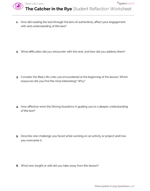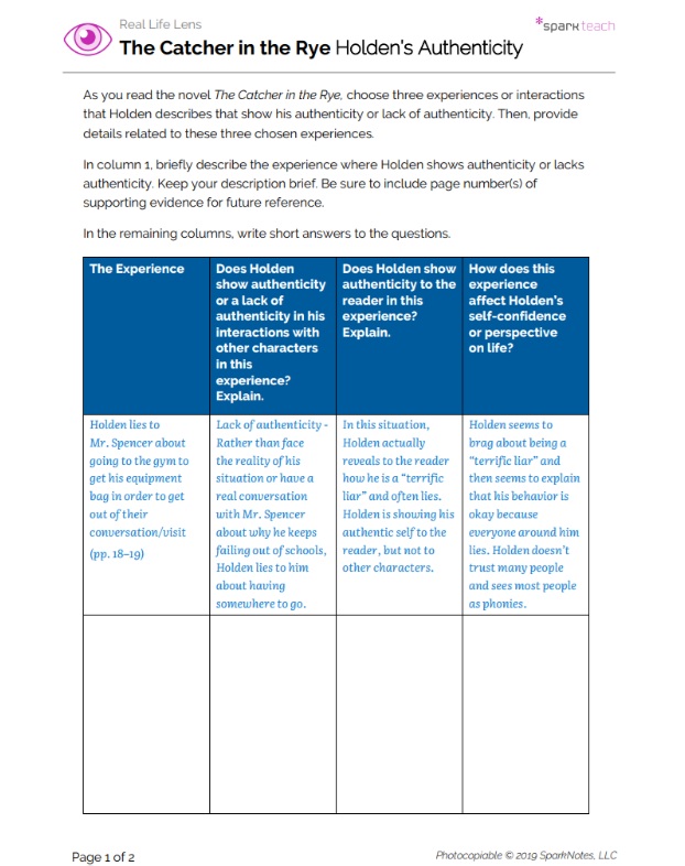 Then, have students use their completed worksheets to guide discussion (orally or in essay form) about Holden Caulfield’s authenticity as a character in one of the three listed experiences or interactions.