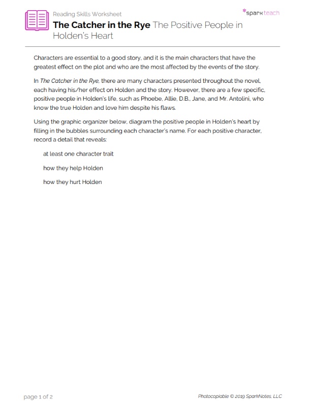 Exploring the connections among the characters in a text helps students better understand the main character’s actions and motivations and appreciate the intricacy of the text as a whole. Students will use this graphic organizer to map the positive people in Holden’s heart as well as their influence on Holden and the story.