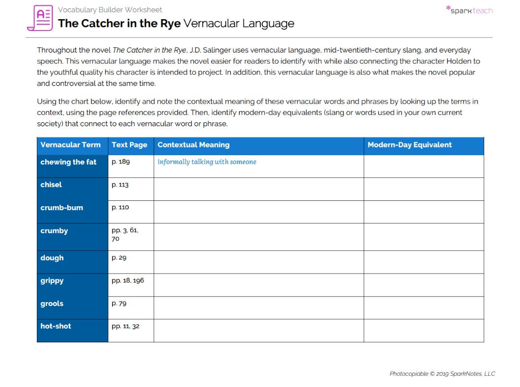 The use of vernacular language in a text reflects a specific time and place in society and helps create vivid, realistic characters. Students will use this vocabulary worksheet to identify vernacular language used in The Catcher in the Rye, using context clues to find meaning while also making connections to modern-day language.