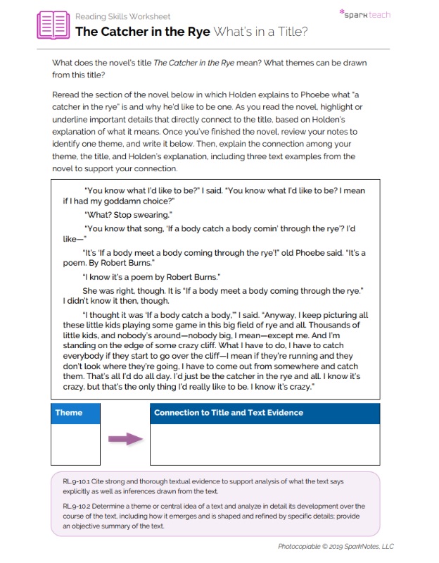 Authors carefully name their works to reflect a greater meaning or theme of the text. Understanding a text’s title strengthens a reader’s overall understanding of the story and its message. Students will use this worksheet to reread the passage in which Holden explains to Phoebe why he wants to be “the catcher in the rye” and then make connections between the novel’s title and one of its major themes. Use this worksheet after students have read the entire novel.