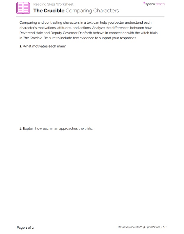 Understanding a character’s motivations, thoughts, feelings, and actions is central to a developed comprehension and appreciation of any work of literature. Reverend Hale and Deputy Governor Danforth are two pivotal characters in The Crucible who influence the witch trials. Students will use this worksheet to analyze and understand the motivation, approach, thinking, and conclusions each character has about the trials.