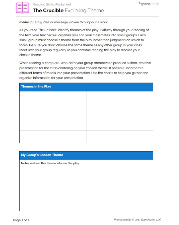 Identifying themes is crucial to the comprehension of any work and helps the reader better understand an author’s overall message and/or purpose. Students will use this worksheet to explore the numerous themes in The Crucible. Pass out the worksheet before reading begins so students can identify themes as they read. Halfway through the play, organize students into groups and have each group select one theme to continue to explore as they finish reading the play. Schedule time every few days for groups to meet and compare notes and add to their worksheet. At the play’s conclusion, each group will give a presentation about how their theme informs the play.