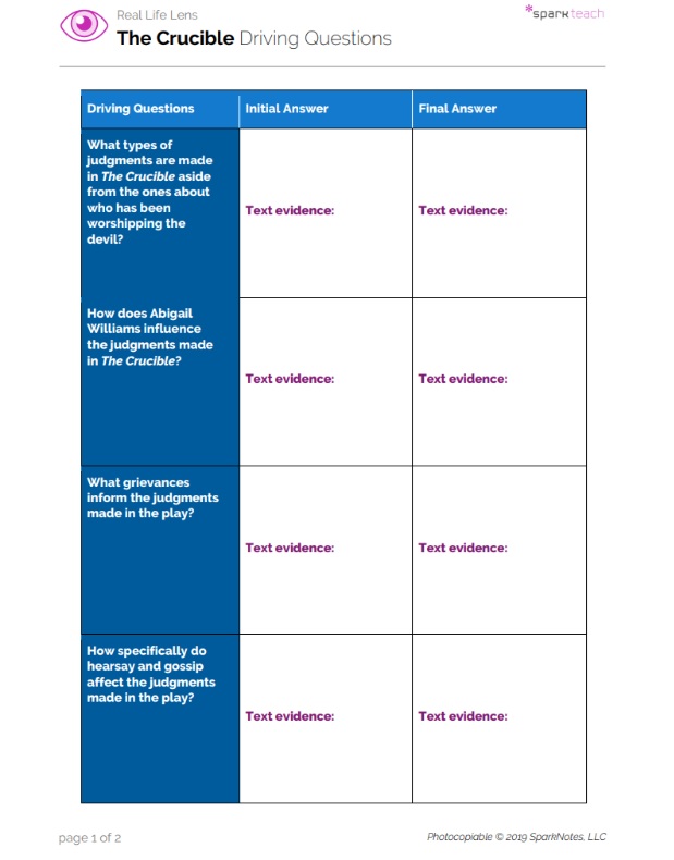 Hand out the Driving Questions Worksheet. Review the questions as a class. Students should enter initial answers to the questions before and as they read The Crucible. They will revisit the questions and revise their answers following the lesson activities, classroom discussion, and the completion of the text. Remind students to support their responses with text evidence.