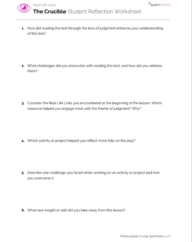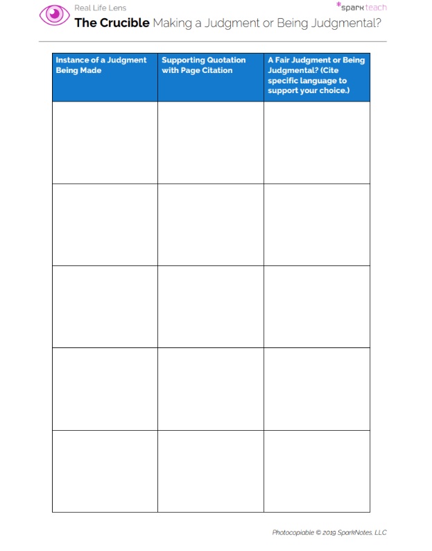 Collect students’ observations on the board. These observations can be revisited while students read The Crucible through the lens of judgment to see how their understanding of making and accepting judgments develops.