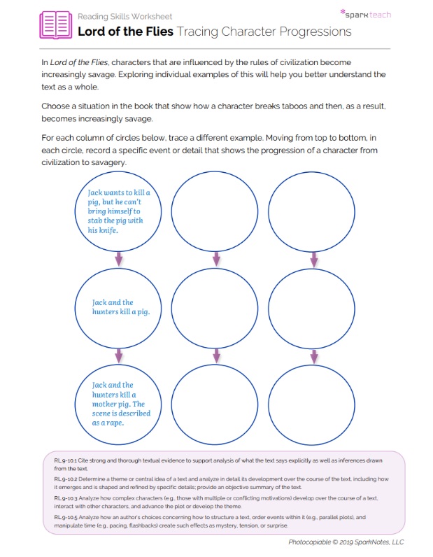 Readers can learn much about a text’s major themes by examining character development. Students will use this worksheet to understand a major theme of Lord of the Flies: crossing boundaries and escalating savagery. Students will be asked to trace three examples of a specific character or situation becoming increasingly violent.