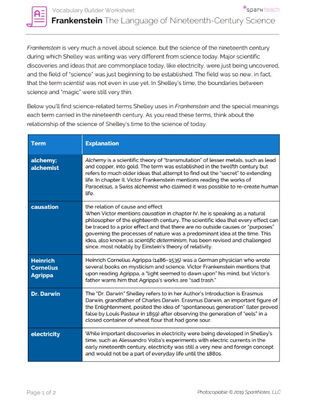 Just as scientific attitudes, methods, and discoveries have evolved over the centuries, so too has scientific language. This handout presents a list of science-related terms used in Frankenstein and their significance in the nineteenth century. Consider introducing this handout to students prior to reading Frankenstein to support comprehension as well as guide discussion on notable differences between eighteenth-century, nineteenth-century, and contemporary science.