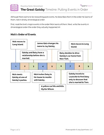 Complex text structures, in particular structures in which events are revealed out of chronological order, can confuse a reader, weakening comprehension. Students will use this worksheet to put events presented by Nick in The Great Gatsby in chronological order to better understand the novel and to draw conclusions about how the structure affects the reader. Hand out the worksheet after students have finished the novel. As a class, discuss how learning of the events as Nick learns of them has a different effect than if the events had been revealed in chronological order.