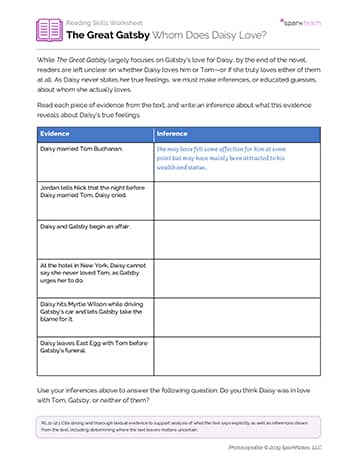Making inferences is a powerful way for students to deepen their comprehension of a text. Students will use this worksheet to make inferences about whom Daisy actually loves—Tom or Gatsby or neither. For each piece of textual evidence provided, students will record their inferences as to what the details reveal about Daisy’s true feelings. They will then use these inferences to make a determination about whom Daisy loves.