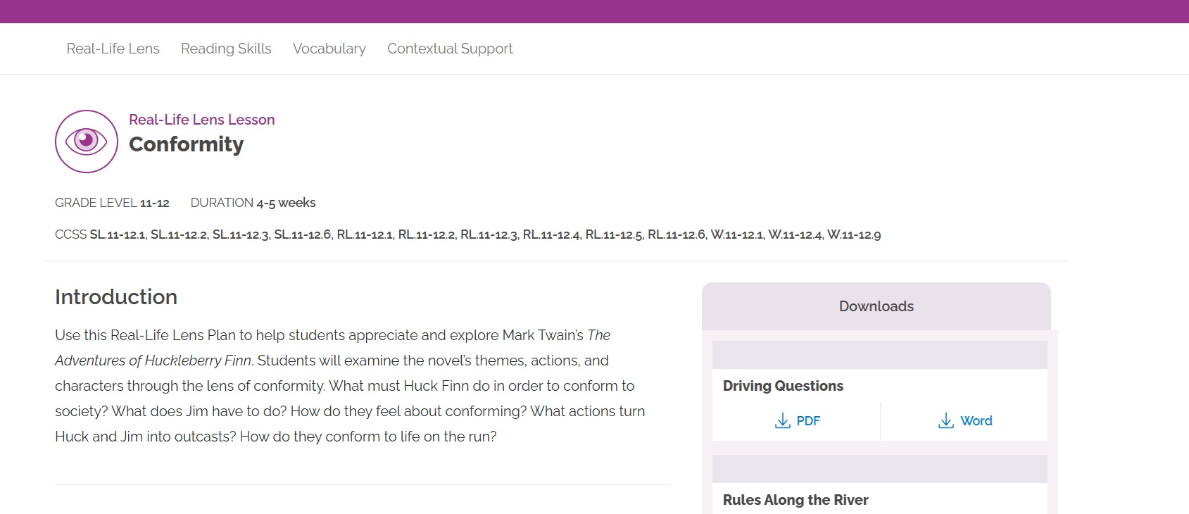 Students will use a plot map, quotes from the text, and questions to interpret how Huck's character evolves throughout the novel. They will then write a short essay on the topic.