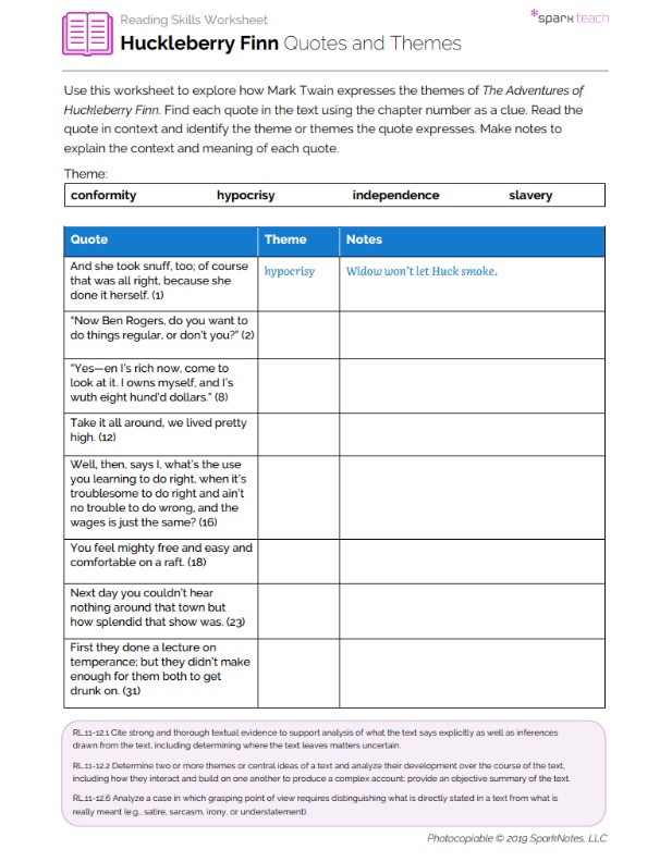 Authors reveal a story’s themes in various ways, including through the words spoken by the characters. Students will use this worksheet to explore how Mark Twain expresses the themes of The Adventures of Huckleberry Finn through direct quotations. Students will find quotes in the text using chapter numbers as clues, read the quotes in context, identify the theme(s) the quotes express, and explain the meanings of the quotes in context. Assign the worksheet after students have finished reading the novel. Students can work with this material individually or in small groups.