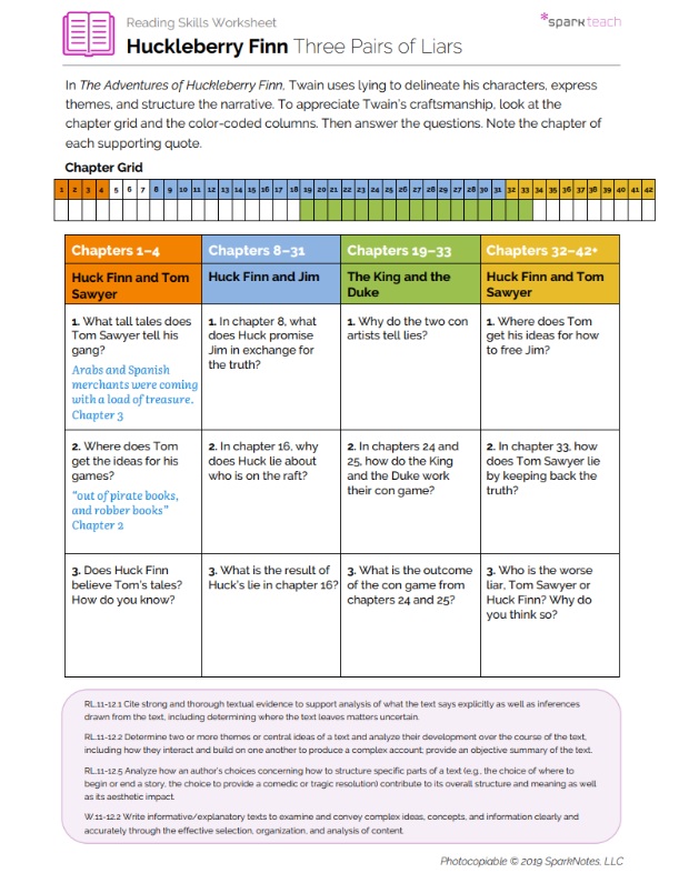 Authors carefully assign personality traits and behaviors to characters to reveal important information. Students will use this worksheet to explore and appreciate how Mark Twain uses lying to delineate his characters, express themes, and structure the narrative of The Adventures of Huckleberry Finn. Students will study the chapter grid and the color-coded columns and then answer several probing questions, noting the chapter of each supporting quote. Assign the worksheet after students have finished reading the novel. Students can work with this material individually or in small groups.