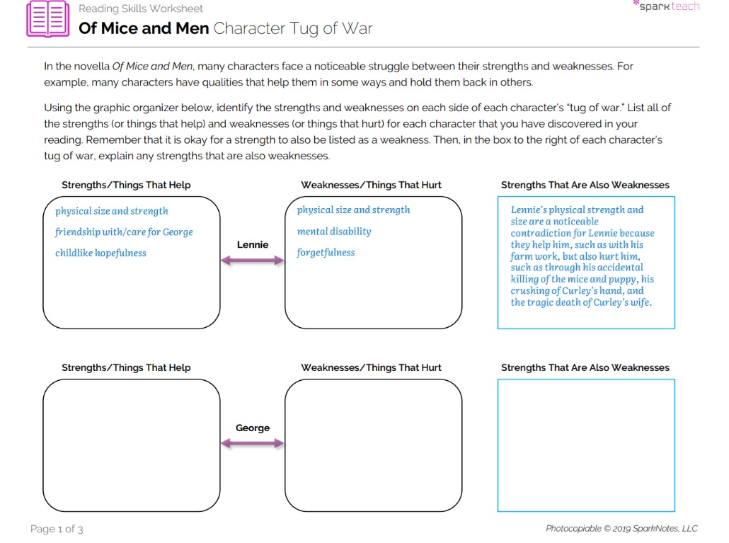 Many of the characters in Of Mice and Men are complex beings with a mix of strengths and weaknesses that seem to battle for control and affect the character’s life in positive and negative ways. Students will use this graphic organizer to examine the struggle between a character’s strengths and weaknesses. You can pass out this worksheet before students read the text and have them work on it as they read, or you can have them complete it as a concluding activity.