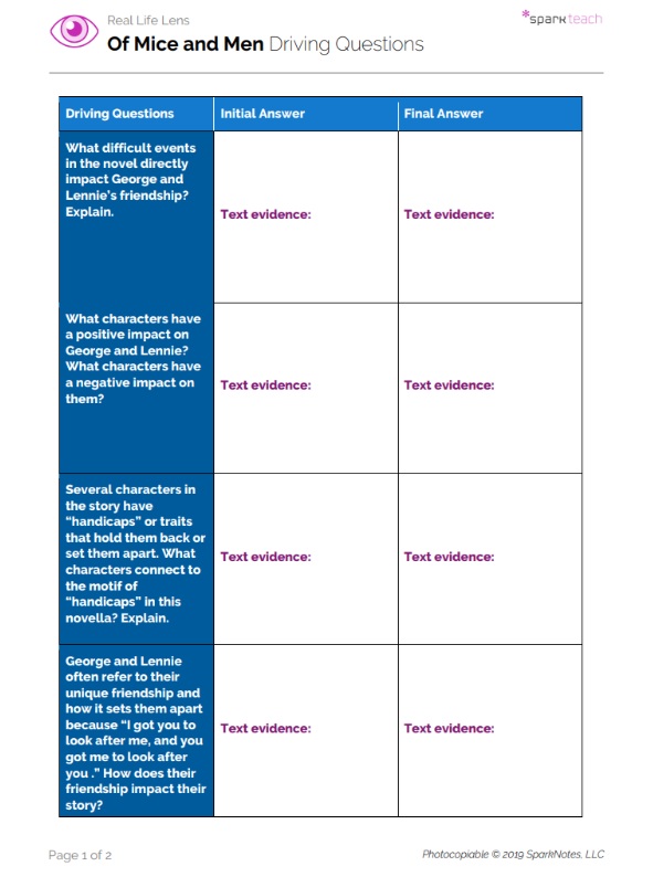 Hand out the Driving Questions Worksheet. Review the questions as a class. Students should enter initial answers to the questions as they read Of Mice and Men. They will revisit the questions and revise their answers following the lesson activities, classroom discussion, and completion of the text. Remind students to support their responses with text evidence.