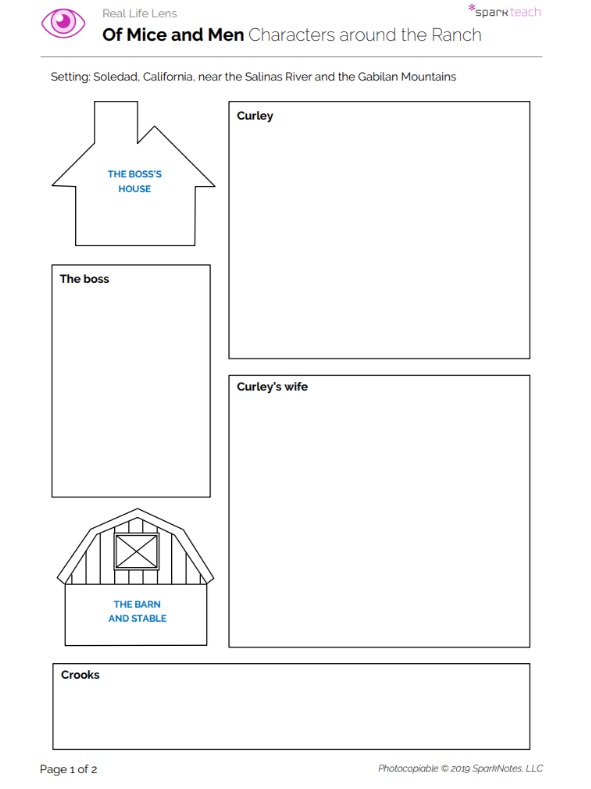 Several characters live at the ranch in Soledad, California, where Lennie and George begin working. Have students work individually to create a character map, noting character details they’ve learned by the midpoint of the novella. Pass out the Characters around the Ranch Worksheet.
