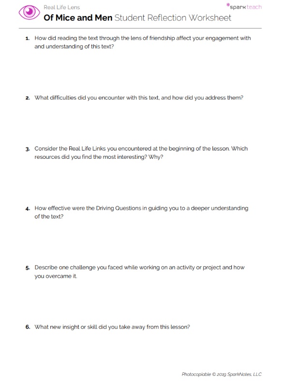 After completing the worksheet, have pairs or small groups discuss the characters’ roles in the story and whether/how the characters influence George and Lennie’s friendship.